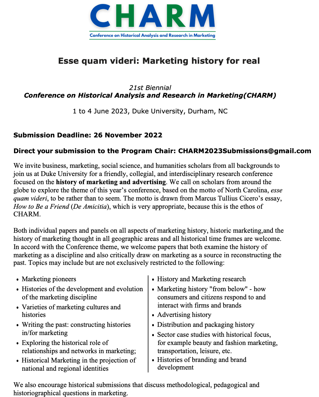 Submit a full paper or extended abstract. All paper submissions (full and extended abstracts) will be double-blind reviewed and a proceedings volume will be published. Full papers (between 8,000 and 12,000 words, inclusive of references and all other items) or extended abstracts (between 1,200 – 1,500 words) may be submitted. Authors may choose to publish either full papers or extended abstracts in the proceedings. To provide reviewers with sufficient information, extended abstracts should include the research purpose, source material or data, and sample references. Please note: submitting a full paper to the proceedings volume does not preclude a submission of your paper to a journal. The copyright of a paper published in the CHARM proceedings remains with its authors, and over the years many CHARM conference papers have made their way into marketing, historical, sociological and other journals.
